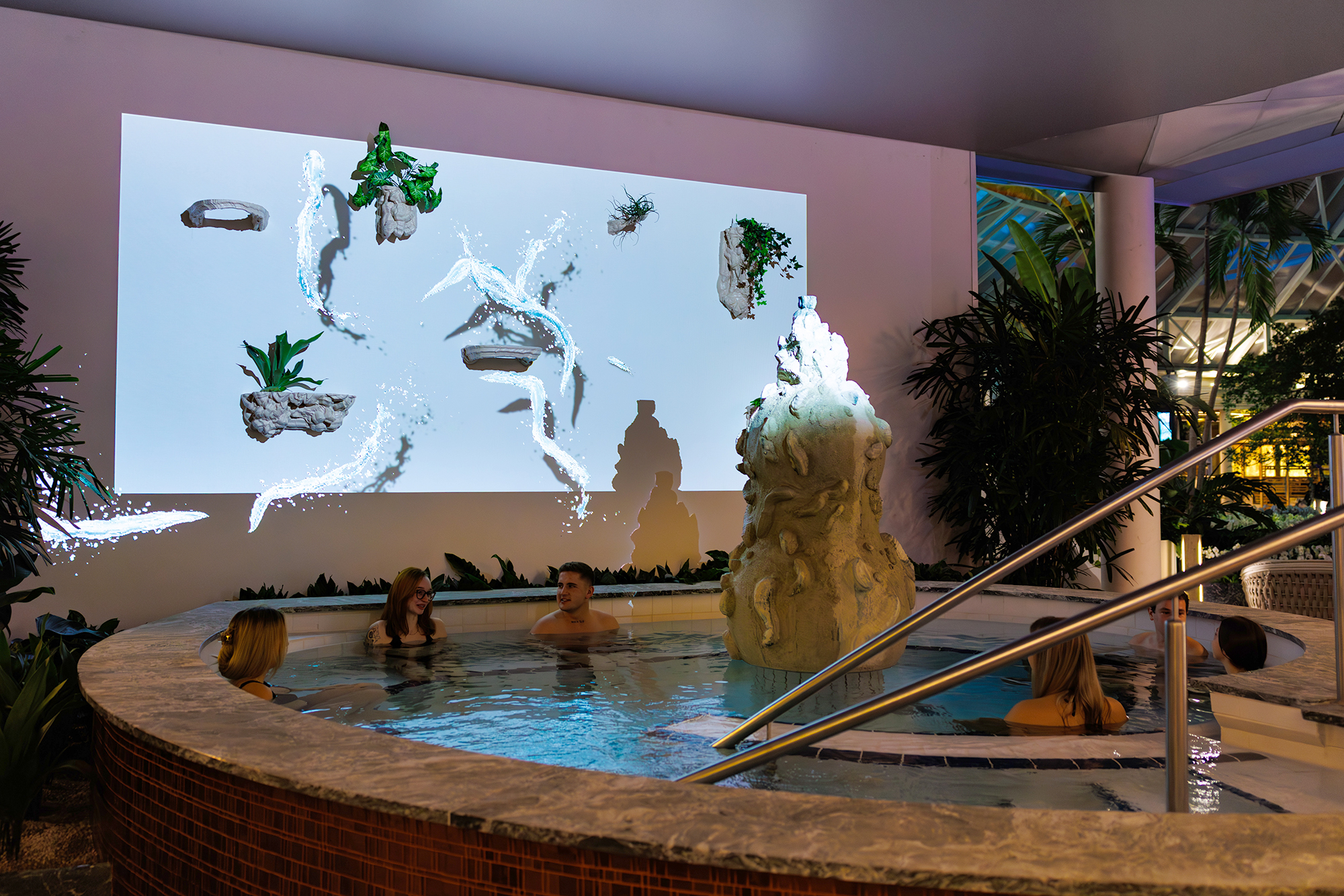 Positioned within an intimate circular pool called the Jungbrunnen, Flying Waters Erding is a generative video projection of animated water jets that appear to soar between sculptural elements and plants installed along the wall behind the circular wellness pool. As the work is fully generative, no pattern ever repeats – each moment offers a unique visual choreography. As visitors sit and relax in the warm water, the ever-changing animated jets move with a playful, game-like quality, blending the digital and physical dimensions of contemporary life. Anyone who enters the Jungbrunnen naturally becomes part of the artwork and vice versa, creating a dynamic interplay between real and virtual movement. The work celebrates the importance of taking time off and play, reflecting Therme Group’s commitment to creating environments designed for rest and connection to support a more balanced and sustainable way of living.